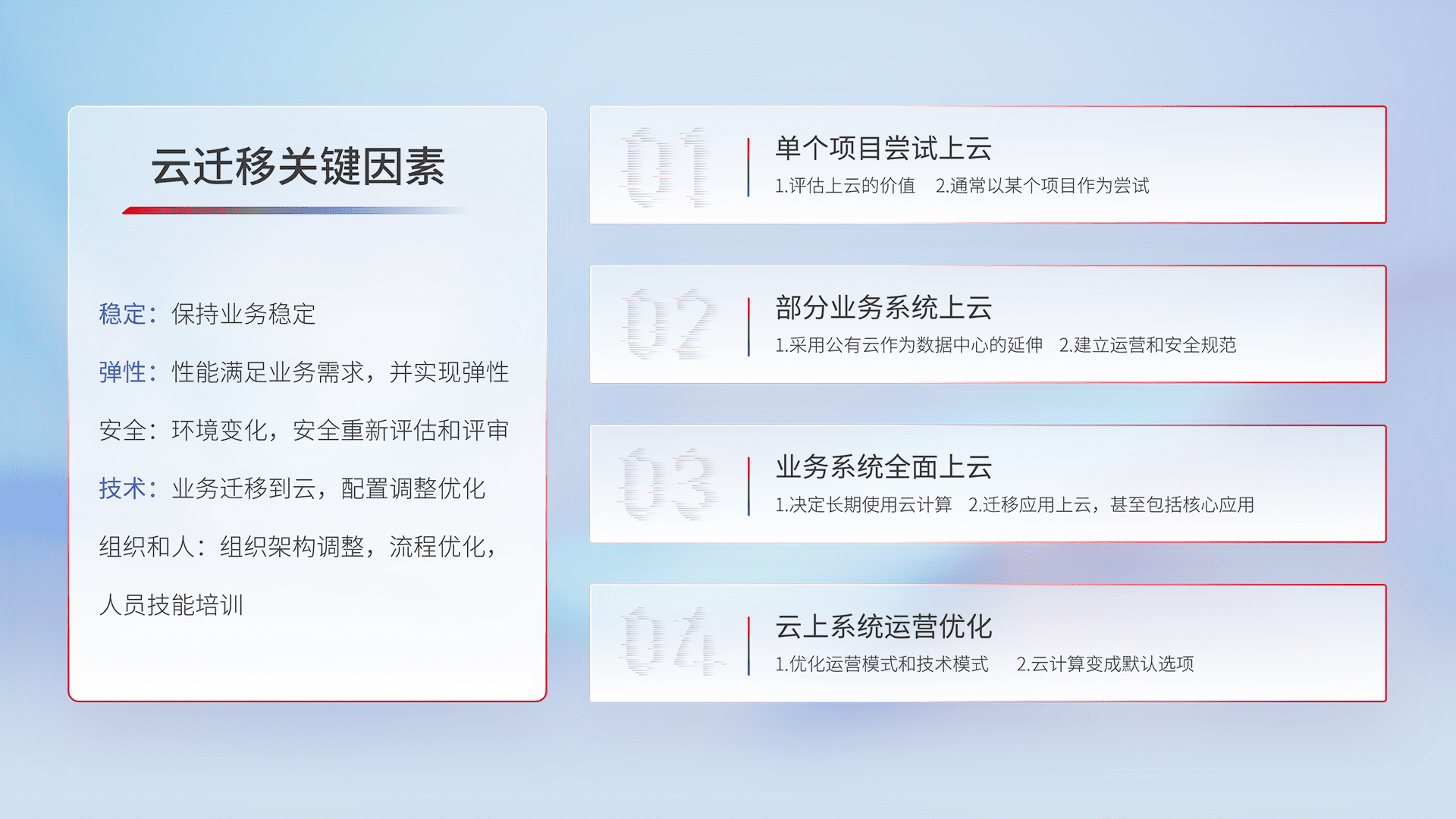 结合实际业务,,,从规划设计、、云平台选型、、、、云原生改造、、、、数据迁移、、、、集成交付,,迁移全过程为客户识别最佳上云路径,,做好风险识别管理,,设计网络架构、、身份权限、、、、安全审计合规、、、操作审计、、日志审计、、监控告警策略、、多站点容灾设计等,,,对云上基础设施进行整体规划,,,提升IT治理水平,,以满足弹性、、、高可用、、、、高性能的需求。。。