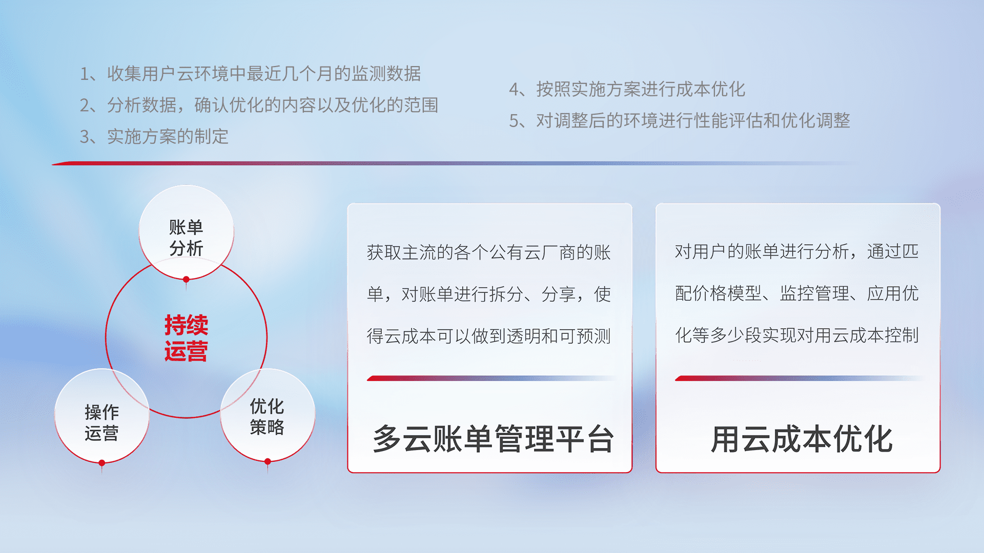 通过多云纳管,,,以统一的资源数据模型把客户的云资源进行抽象和封装,,,进而实现对多云资源的统一操作,,,保障云资源管理的可靠性、、、稳定性与可用性。。量身定制化运维内容,,配置、、、开发运维、、补丁管理、、、备份、、、、监控、、、认证和访问管理、、审计和日常巡检等,,保障在用云过程中的可靠度,,,稳定度以及高可用率。。。